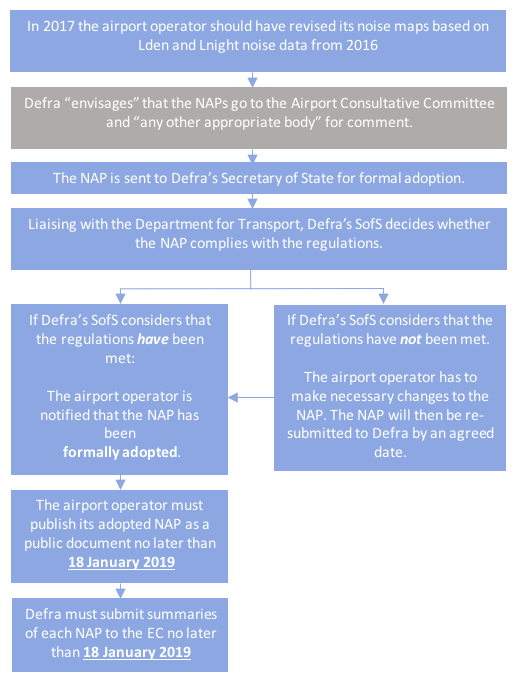 It is worth referring to the latest version of Defra’s Airport Noise Action Plans: Guidance for Airport Operators on how to revise Noise Action Plans under the Environmental Noise (England) Regulations 2006 (as amended). Defra has told us it is currently unable to publish the full NAPs guide on their website due to technical reasons. However, you can access the full guide on AEF’s website here.