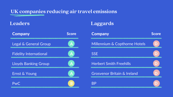 Of the 39 businesses analysed from the UK, four have received the highest grade in the Travel Smart ranking system. Legal & General Group, Ernst & Young, Fidelity International and Lloyds Banking Group have all committed to an absolute reduction in air travel emissions, and Fidelity and Lloyds lead the UK with a 50% reduction target by 2025. All four of these companies have been setting an example by reporting their air travel emissions for more than a year.